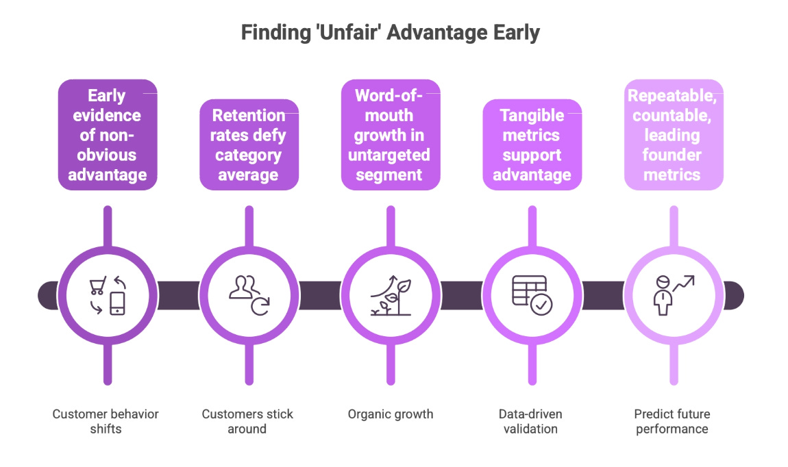 When evaluating a startup’s business model, look for proof of concept along their chosen dimension. Early evidence, even messy and incomplete, that the non-obvious advantage is beginning to matter. This is visible in customer behaviour before it shows up in market data. Customers doing unexpected things with the product. Retention rates that defy the category average. Word-of-mouth growth in a segment nobody targeted on purpose. The advantage must be tangible in the metrics, not just asserted in the pitch deck. Look for what I call founder metrics: numbers that are repeatable (not one-off wins), countable (with real data behind them), and leading (they predict future performance, not just describe the past).