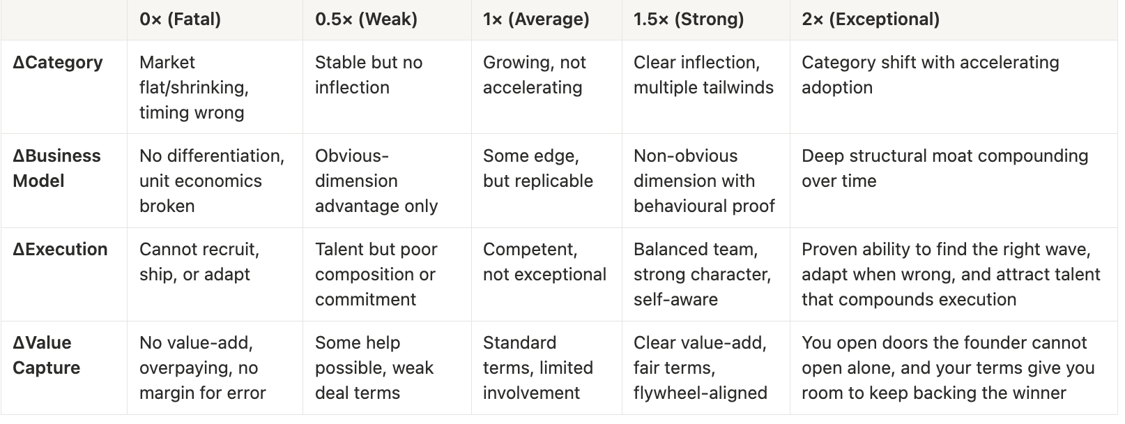 Each delta represents a dimension of uplift. Category is the wave the company is riding. Business Model is how the company converts that wave into durable advantage. Execution is the team’s ability to build, adapt, and endure. Value Capture is the investor’s lever: it combines what you contribute to the company (improving probability of success) and how you structure the deal (improving your payout when that success arrives).
