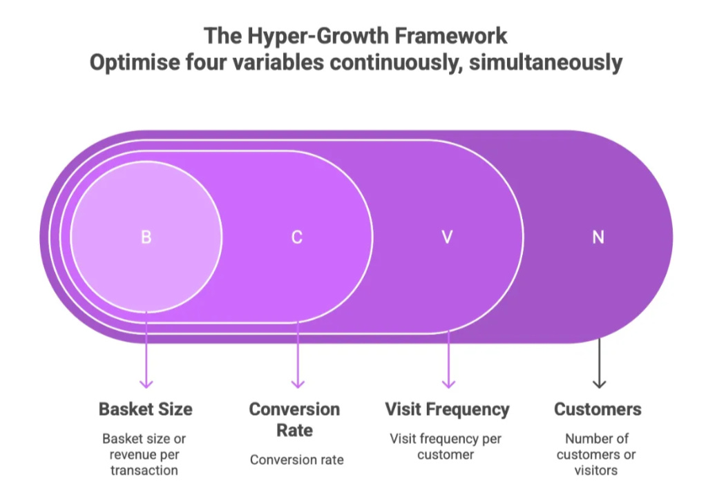 Where N is the number of customers or visitors, V is visit frequency per customer, C is conversion rate, and B is basket size or revenue per transaction. Improving each by just 10% produces nearly 50% total growth, because the relationship is multiplicative. Improving each by 80% results in 10X growth.