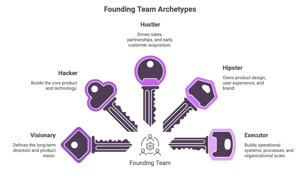 Composition matters because no single founder embodies everything a startup needs. In my Team Design Framework, I describe how the structure of your team becomes the structure of what you build, following Conway’s Law. The same principle applies to founding teams: a team heavy on vision but light on execution will build something beautiful that never ships. A team heavy on hustling but light on product thinking will ship something that nobody loves. A balanced founding team contains several archetypes, and the interplay between them determines how well the company navigates the full journey from idea to scale. The Visionary defines the long-term direction and product vision: where the company is going and why it matters. The Hacker is the technical architect building the core product and technology. The Hustlerdrives sales, partnerships, and early customer acquisition: the commercial engine. The Hipster owns product design, user experience, and brand: how the company feels to its users. The Executor builds operational systems, processes, and organisational scale: how the company actually works as it grows.
