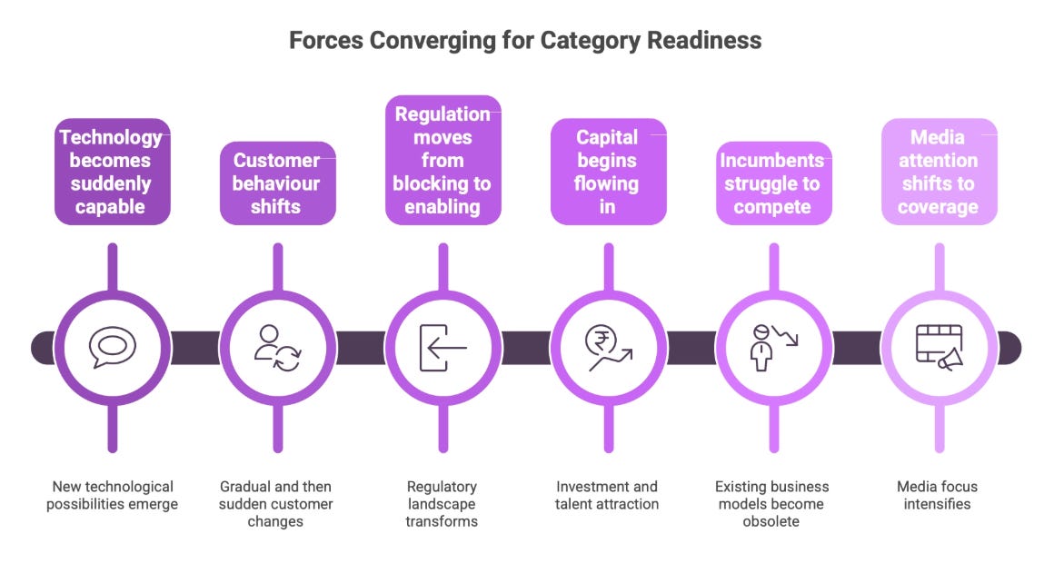 What makes a category ready? Several forces converge at once. Technology becomes suddenly capable of something previously impossible or prohibitively expensive. Customer behaviour shifts, often gradually, then all at once. Regulation moves from blocking to enabling, or creates disruption by changing the rules. Capital begins flowing in, which attracts talent, which accelerates development, which attracts more capital. Incumbents discover that their existing business models, distribution, or incentives actively prevent them from competing on the new dimension. Media attention shifts from scepticism to breathless coverage.