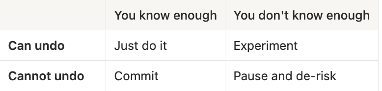 The grid asks two questions. Can you undo this? And do you know enough? That gives you four boxes: