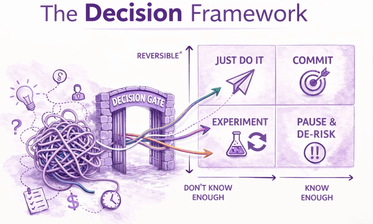 You understand what is going on and you can change course if you are wrong. Speed wins. Most daily work decisions live here: which vendor to trial, which design to test, which meeting format to try. The mistake people make is treating these like they are permanent. They schedule three rounds of review for something they could reverse in an afternoon.