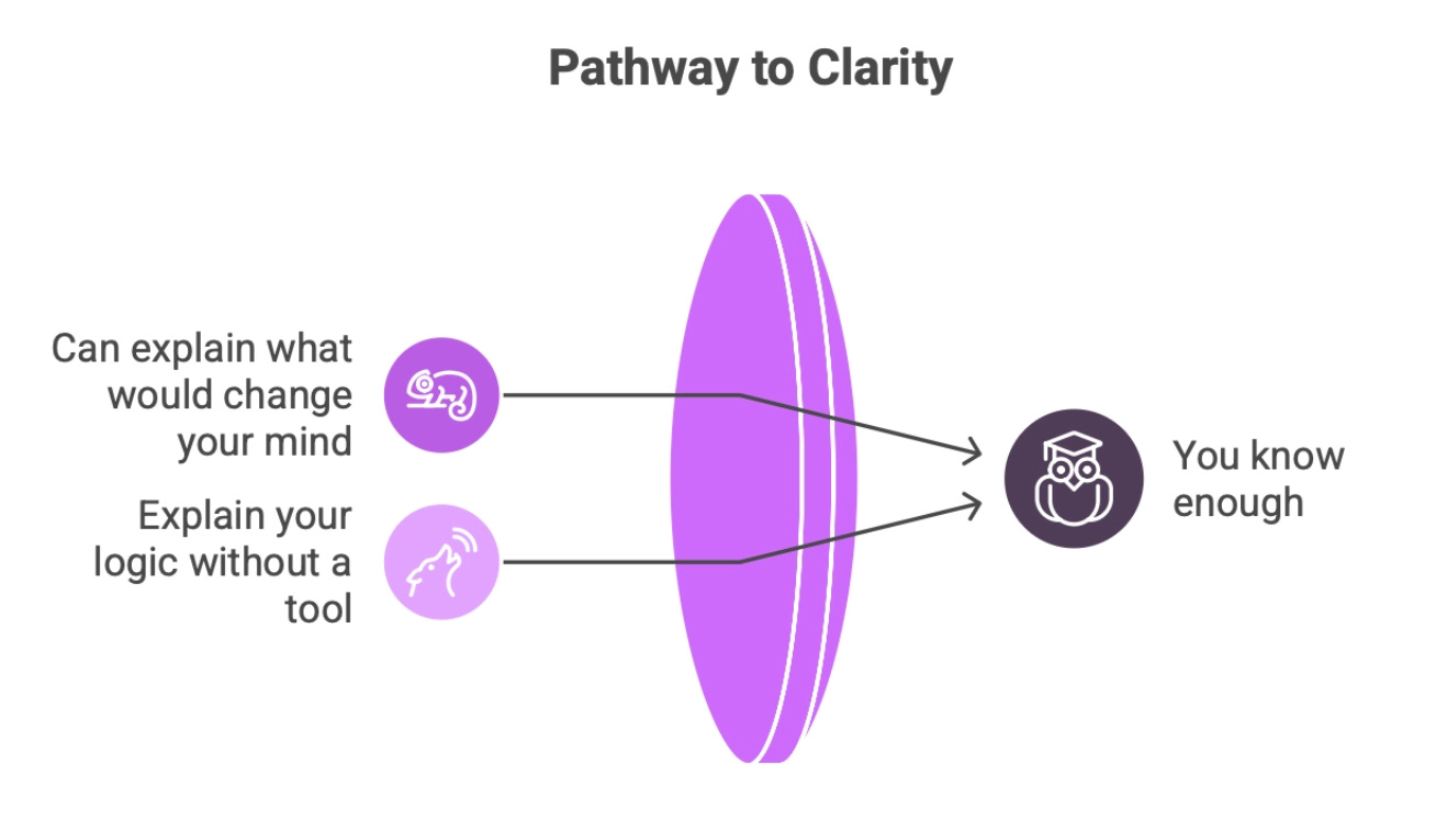 And on information: people are bad at knowing when they know enough. AI makes this worse because it gives you confident-sounding material very fast. One test cuts through the noise: you know enough when you can say what would change your mind, and you could explain that logic without leaning on a tool. If you cannot name the thing that would make you choose differently, you have not actually thought about the decision. And if your explanation starts with "the AI told me," you have information but not understanding. Those are not the same thing.