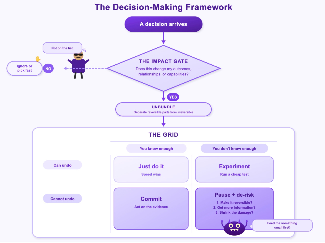 Leadership: Teach your team the four boxes. Most organisations move slowly because they treat reversible decisions as if they were irreversible. If your team needs three sign-offs to change a slide deck, you have a sorting problem. Push reversible decisions down and fast. Save the careful work for the irreversible ones. And watch for AI-generated false confidence: when someone says “I looked into this thoroughly” and means “I asked ChatGPT,” ask them: what would change your mind? If they cannot answer, they do not know enough yet.