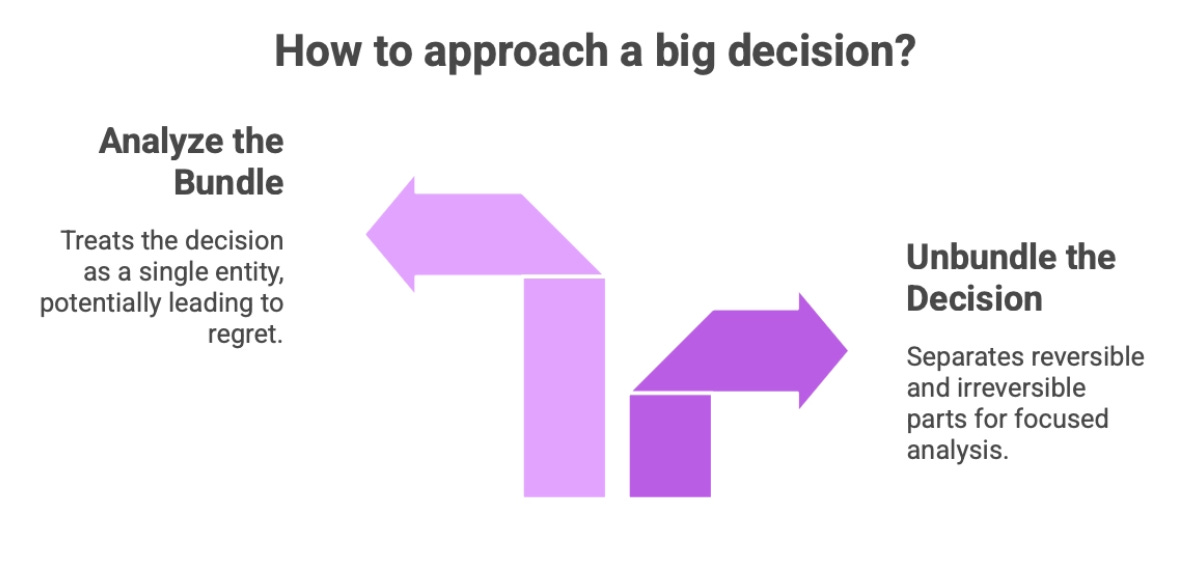 Most decisions are bundles. Leaving a job feels irreversible. But “leaving a job” is actually several decisions bundled together: when to leave, whether to negotiate a return option, how much runway to save, what to do next. Some parts of that bundle you can undo. Some you cannot. The most useful thing you can do with any big decision is unbundle it first. Separate the parts you can reverse from the parts you cannot. Then use the grid on each part, not the whole bundle.