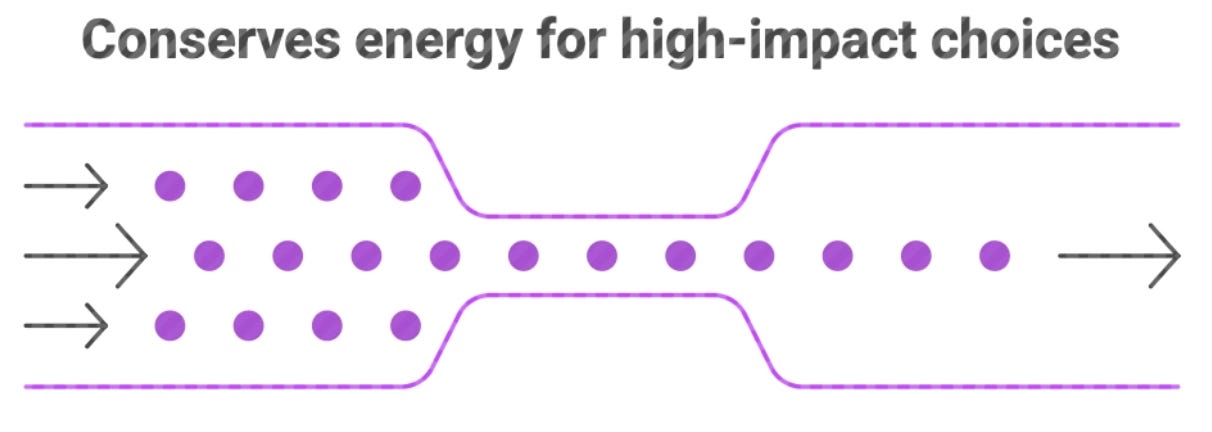 AI makes this gate more important than ever. AI tools throw a blizzard of micro-choices at you: which prompt to use, which suggestion to accept, which of five AI-generated options to pick. None of them matter much on their own, but together they drain the energy you need for the decisions that actually shape your career and life. Treat the gate like a bouncer. Most decisions do not get in.
