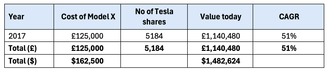 Now, if I had practised delayed gratification and bought the shares in 2017 and only allowed myself to buy my Tesla Model X in 2024 (after I had earned it), I would have had a new Tesla Model X AND $1.2 million instead of a seven-year-old car that has lost 70% of its value.