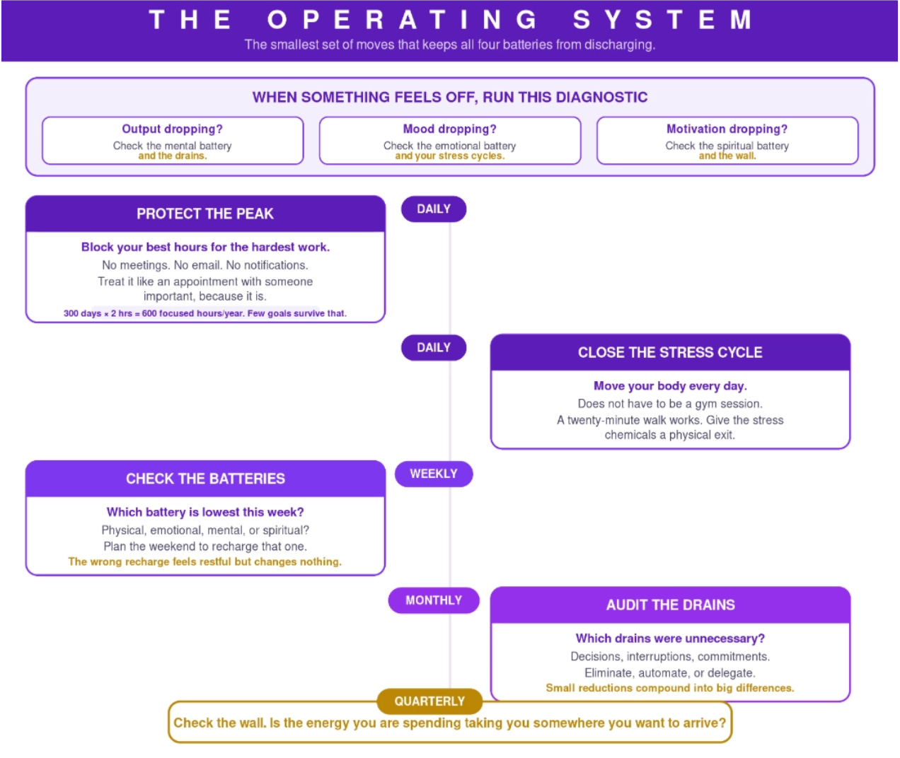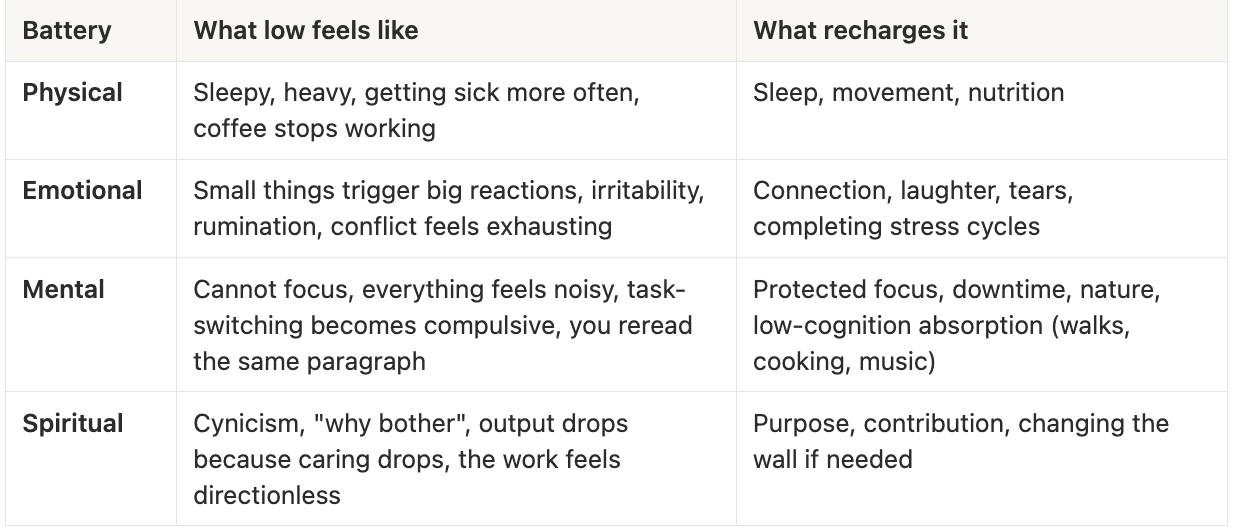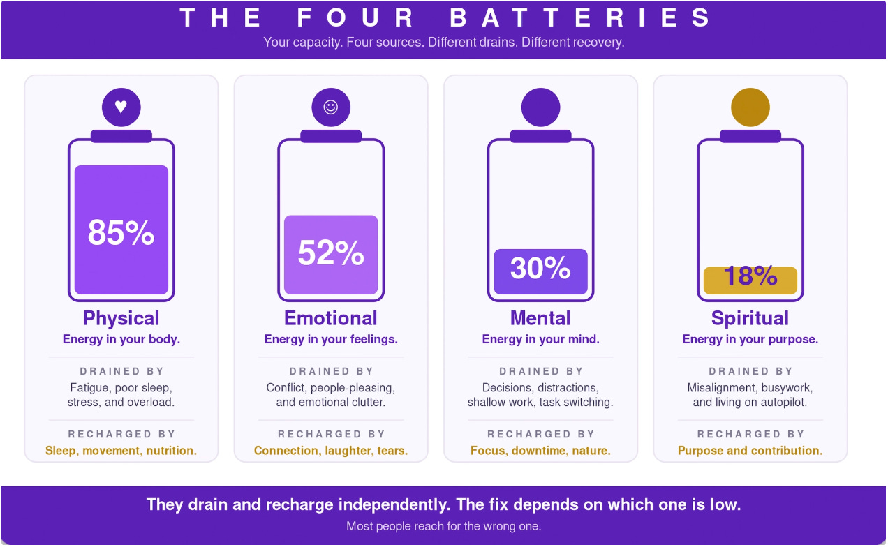 The batteries: Physical (sleep, movement, nutrition), emotional (connection, stress cycle completion), mental (focus, protected from interruption), spiritual (purpose, the wall question). They drain and recharge independently. The fix depends on which one is low, and most people reach for the wrong one.