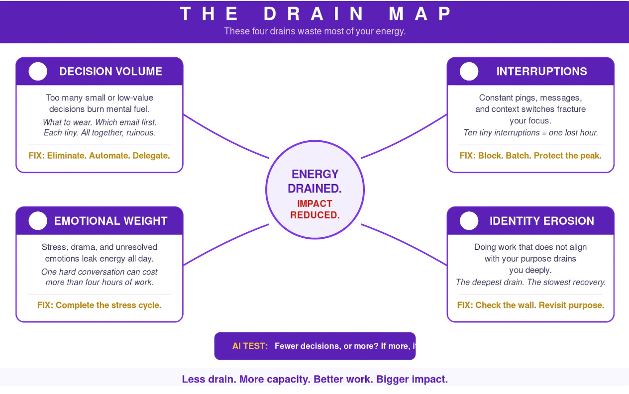 The drains: Decision volume, interruptions, identity erosion. Cut the first two. Monitor the third. Test every tool, including AI, by whether it leaves you with fewer decisions or more.