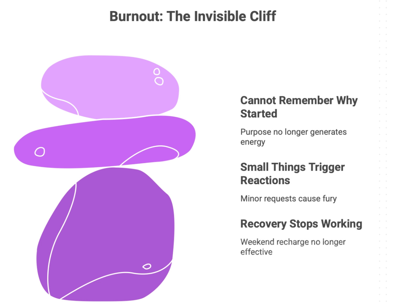 The reason burnout is dangerous is Selye’s cliff. In the resistance phase, you feel functional. You are tired but you are managing. The slide from resistance to exhaustion happens fast and without warning. One week you are grinding but coping. The next week you cannot get out of bed, or you find yourself staring at a screen for twenty minutes without processing a single word. The cliff is invisible from the resistance phase. You only see it after you have gone over it.