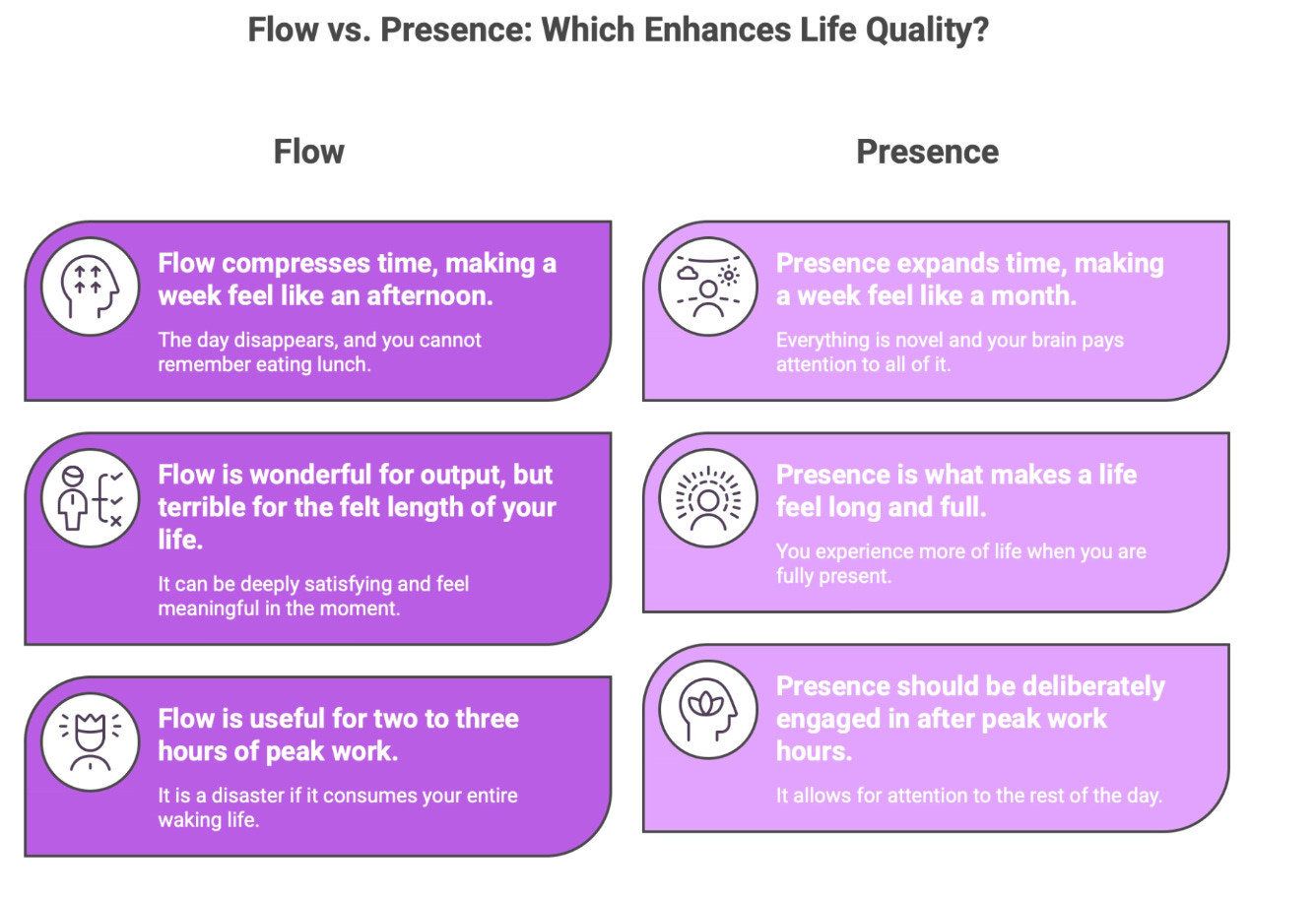 The operating system here treats flow as a tool, not a lifestyle. Use flow for the peak hours. Then come out of it deliberately and pay attention to the rest of the day. Walk somewhere without headphones. Eat a meal without a screen. Have a conversation where you are not thinking about what you need to do next. That attention is what makes a life feel long and full. Flow compresses. Presence expands. You need both, on purpose, not by accident.