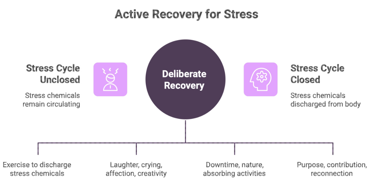 Recovery has to be deliberate because the body does not automatically complete the stress cycle. The Nagoskis showed that stress creates a loop in the body that needs closing. The stressor might end (the deadline passes, the argument resolves) but the stress chemicals are still circulating. They stay until the body discharges them through physical action. Exercise is the most reliable discharge. Laughter, crying, physical affection, and creative expression also work. Scrolling your phone does not. Watching television does not. Sitting still and “relaxing” does not close the cycle. The stress stays in the body, accumulates, and eventually tips you from resistance into exhaustion.