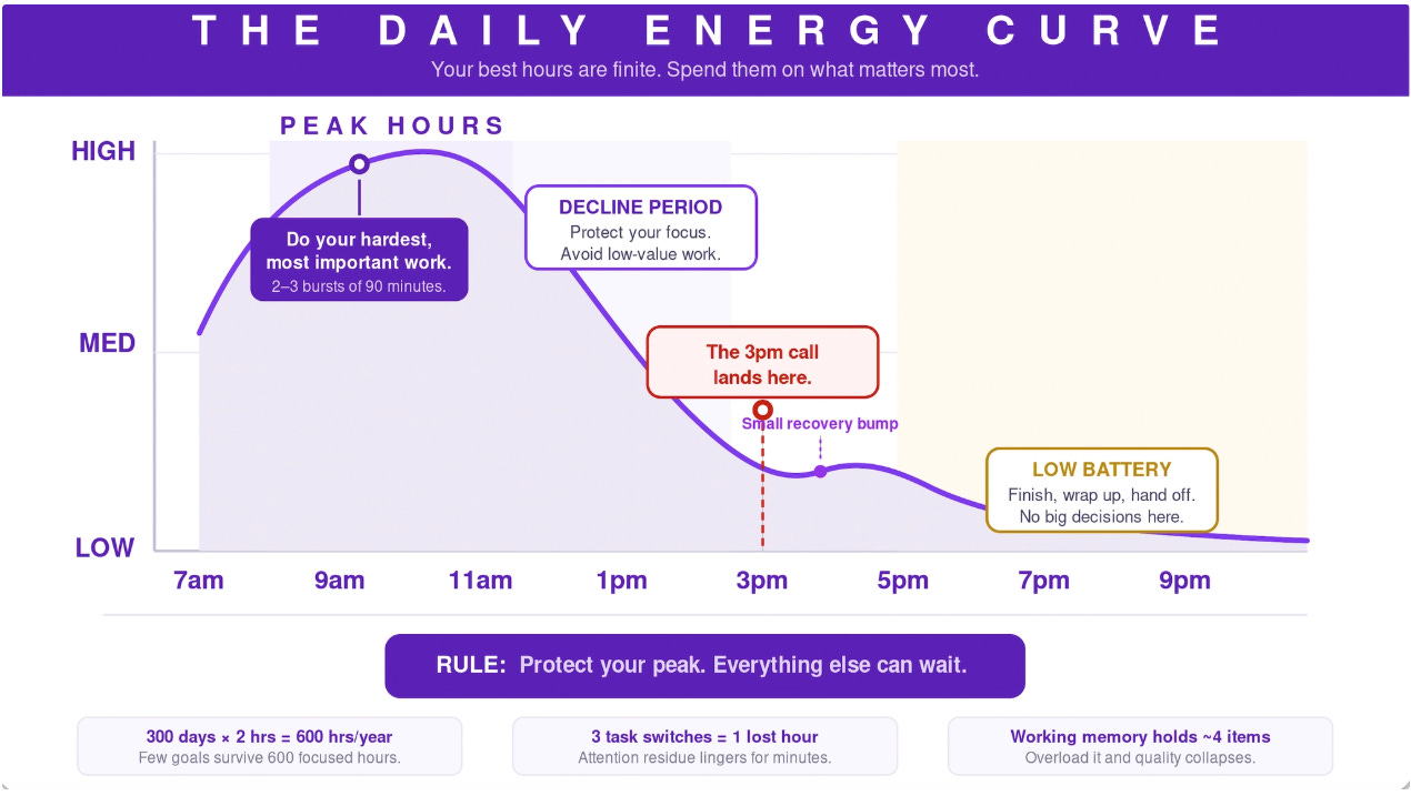 Early career: Your batteries are large and they recharge fast. The danger is not burnout but misdirection. You have so much energy that you can climb any wall at speed, which makes it easy to climb the wrong one for years before you notice. Use the quarterly wall check early. It is cheaper to change walls at 25 than at 45. In my Promotion Flywheel Framework, I describe how the Big Thing requires two protected hours per day. That is not just a career strategy. It is an energy strategy. The two hours protect your best output from being consumed by other people’s priorities.