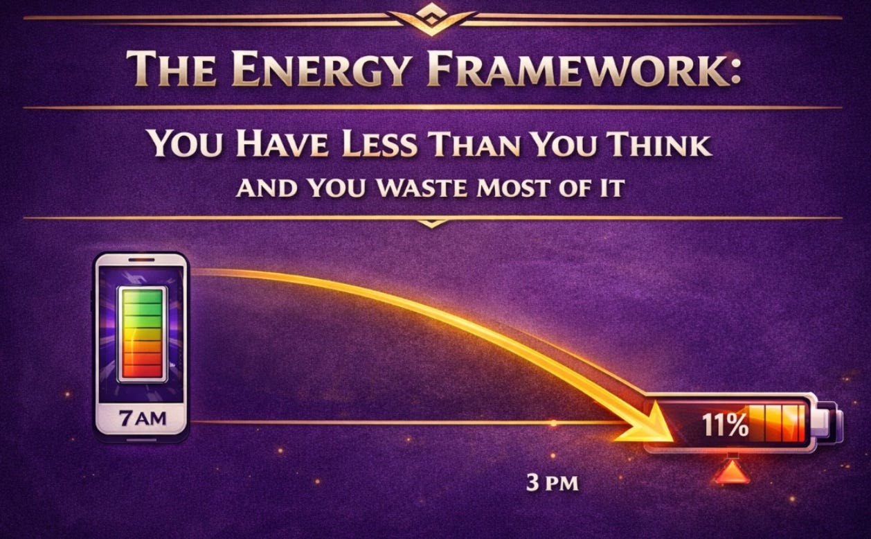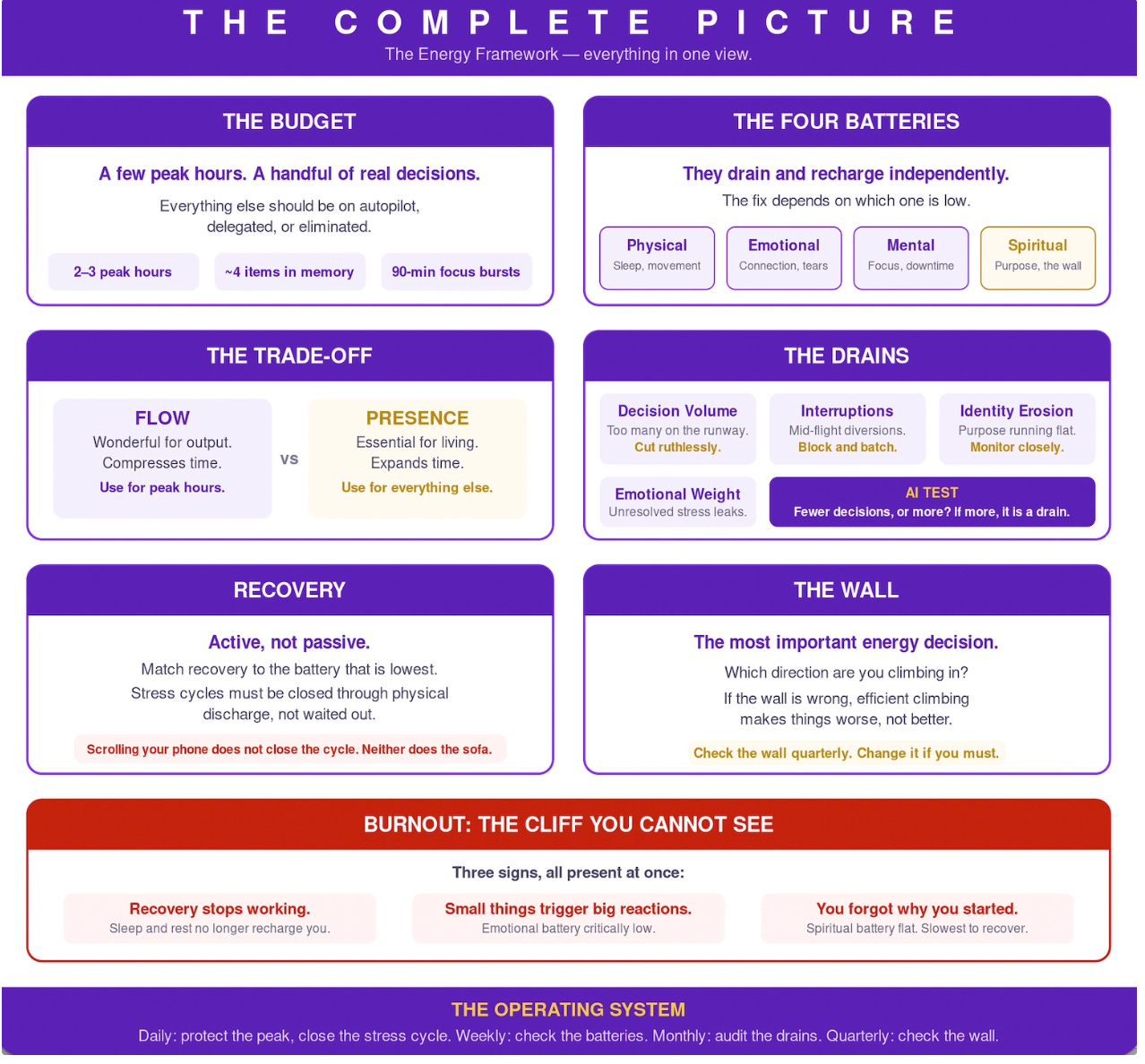 This framework is about how to spend your energy. You have a daily budget of peak hours and good decisions, and it is smaller than you think. You have four batteries, not one, and they drain and recharge independently. There are drains that do most of the damage, a kind of recovery that actually works (it is not rest), and one question about direction that decides whether all your other effort counts or gets wasted. The system runs on a simple rhythm: daily, weekly, monthly, quarterly. If you follow it, you will protect more of your capacity than most people realise they are wasting.