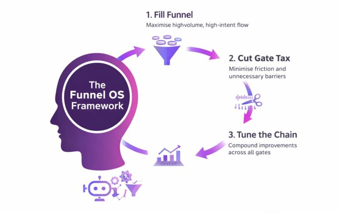 A funnel is any system that turns volume into an outcome through a sequence of gates. This framework focuses on optimising the Funnel ‘operating system’ and tuning it for exponential output growth by deliberately structuring the funnel and using AI in the right places