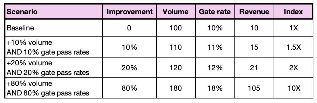 Similar to what we saw with the hyper growth framework, we can optimise the output of each gate in a funnel in a linear way (through trial and error), but optimising multiple gates at the same time could lead to exponential compounding growth in output from the system.