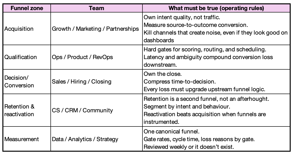 Different teams must own specific parts of the funnel. Structure the organisation so each gate has clear ownership and KPIs, and ensure these are tracked and incentivised.