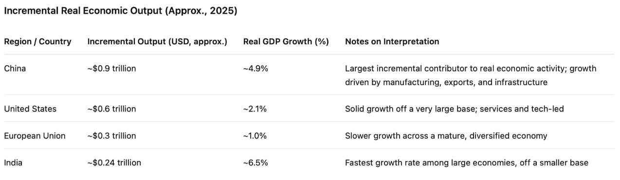 China was still the biggest incremental engine in the real economy in 2025. Roughly $0.9T of added output, versus about $0.6T for the US, $0.3T for the EU, and $0.24T for India. [approx numbers based on projections]