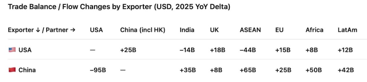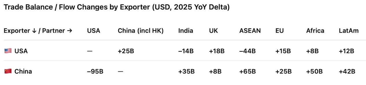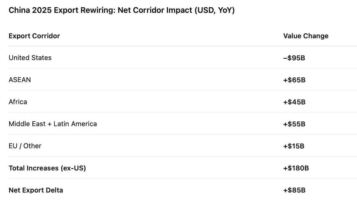China absorbed a large, visible negative shock in exports to the US (–$95B)/-20%, but simultaneously expanded exports across ASEAN, Africa, the Middle East, Latin America, and Europe by +$180B, leaving a net export increase of +$85B.That is what “decoupling” looked like in the data..