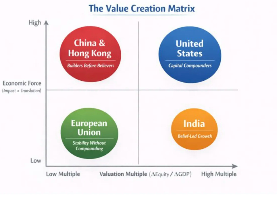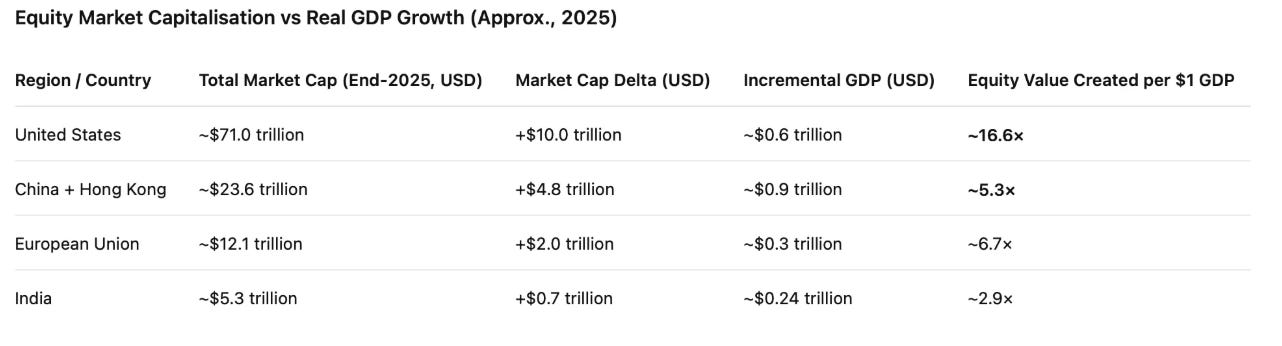 Now look at what equity markets did over the same year (year-end 2025 market cap). The US finished at $71.0T (+$10.0T). China + Hong Kong finished at $23.6T (+$4.8T). The EU finished at $12.1T (+$2.0T). India finished at $5.3T (+$0.7T).