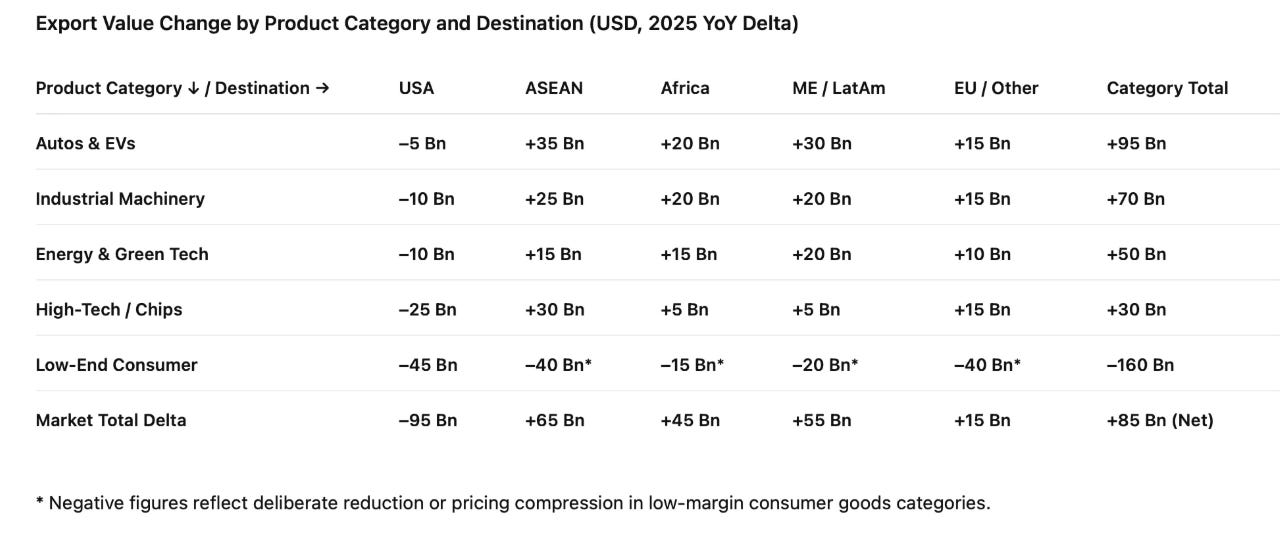 EVs make it legible. China’s incremental exports in Autos & EVs alone (outside the US) more than offset the entire hit from lower US imports across categories.
