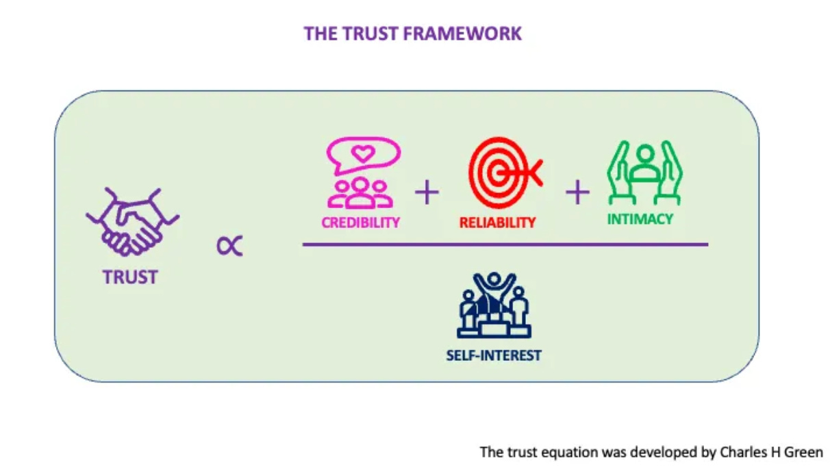 Where the article references the Trust Framework, it points to a separate framework describing how trust is driven by credibility, reliability, intimacy and perceived self-interest over time. The argument here does not depend on prior familiarity with that framework; it draws on the same underlying logic.