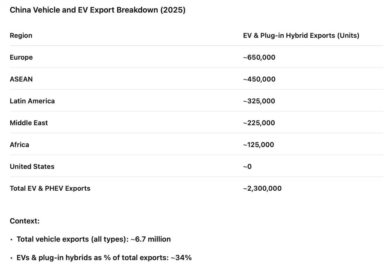 Vehicle and EV export volumes are based on industry reports and customs data for calendar year 2025, and include China-manufactured exports (ICE, EV, and PHEV as specified). Regional distributions are approximate and reflect destination markets rather than final end-use in cases of onward resale.