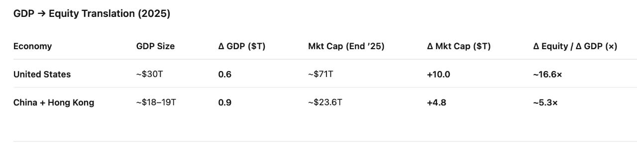 Put bluntly: the US turned roughly $1 of GDP growth into ~$16.6 of equity value. China turned roughly $1 into ~$5.3. The gap is real and persistent.